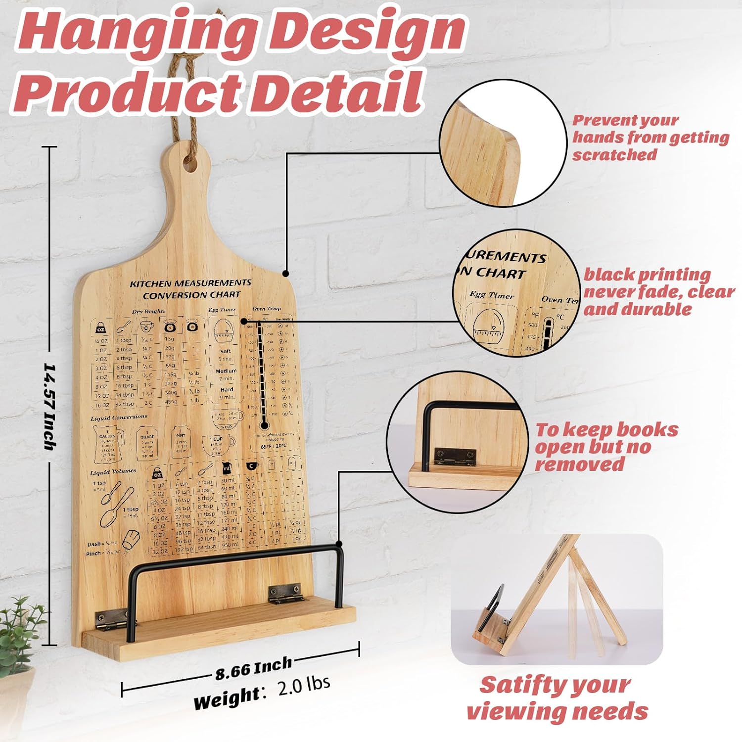 Kitchen Conversion Chart Cookbook Stand, Sturdy Wood Cook Book Holder, Recipe Cookbook Holder Stand with Kitchen Counters, Baking Christmas Gifts for Women, Accessiores for Holding Cookbooks